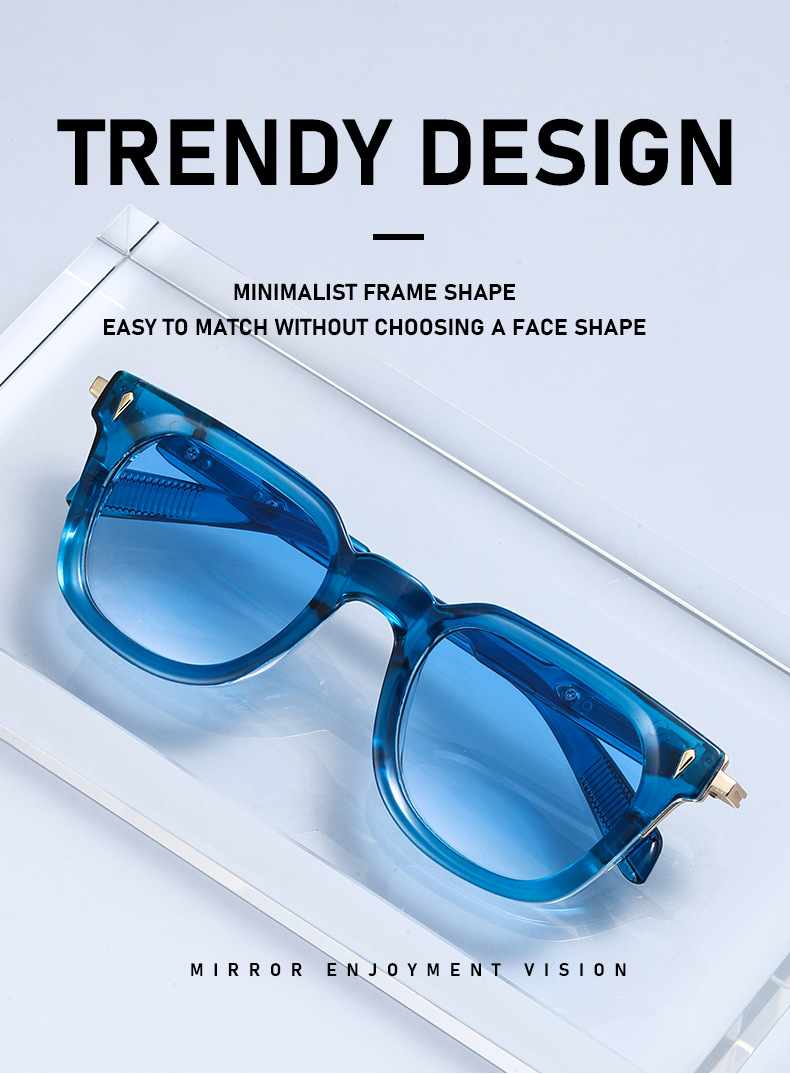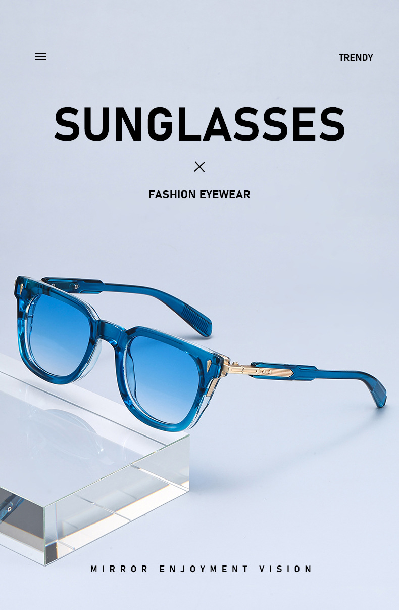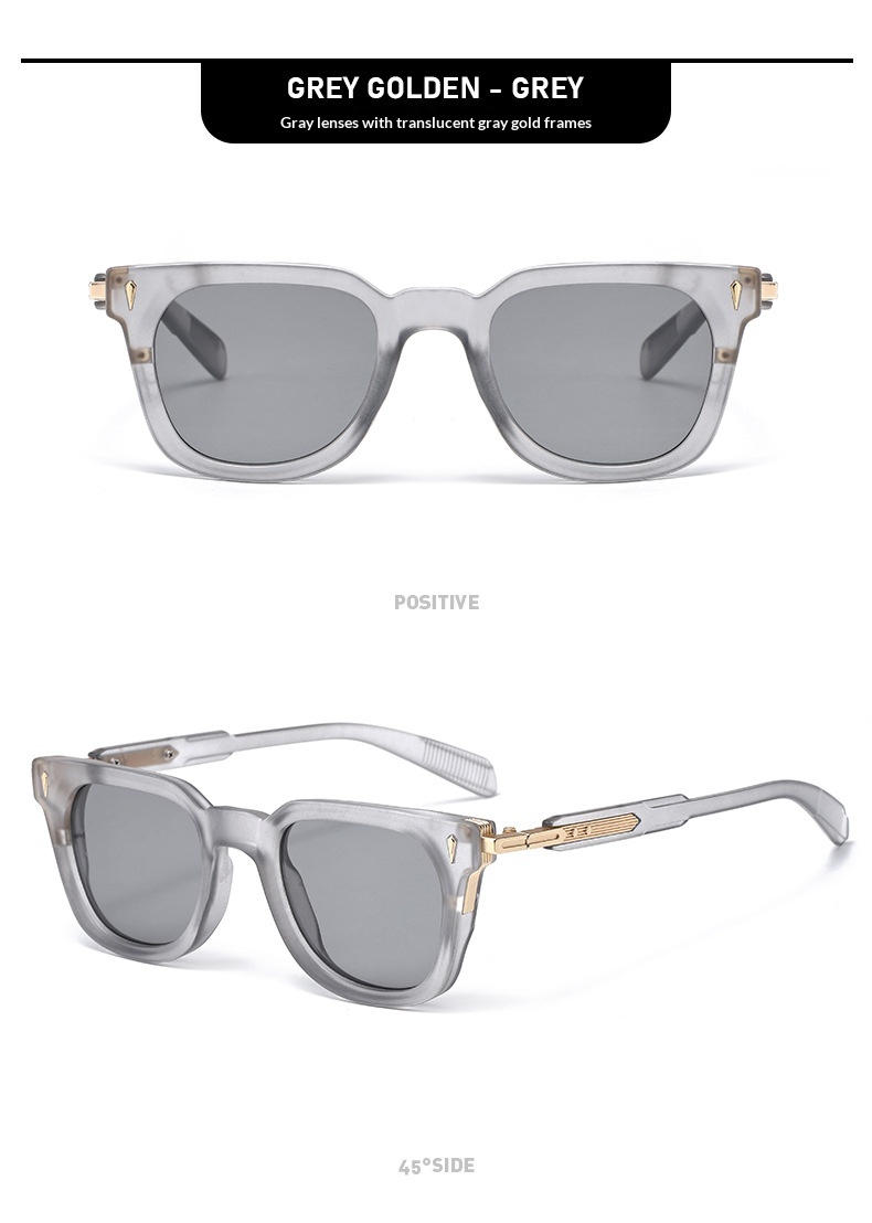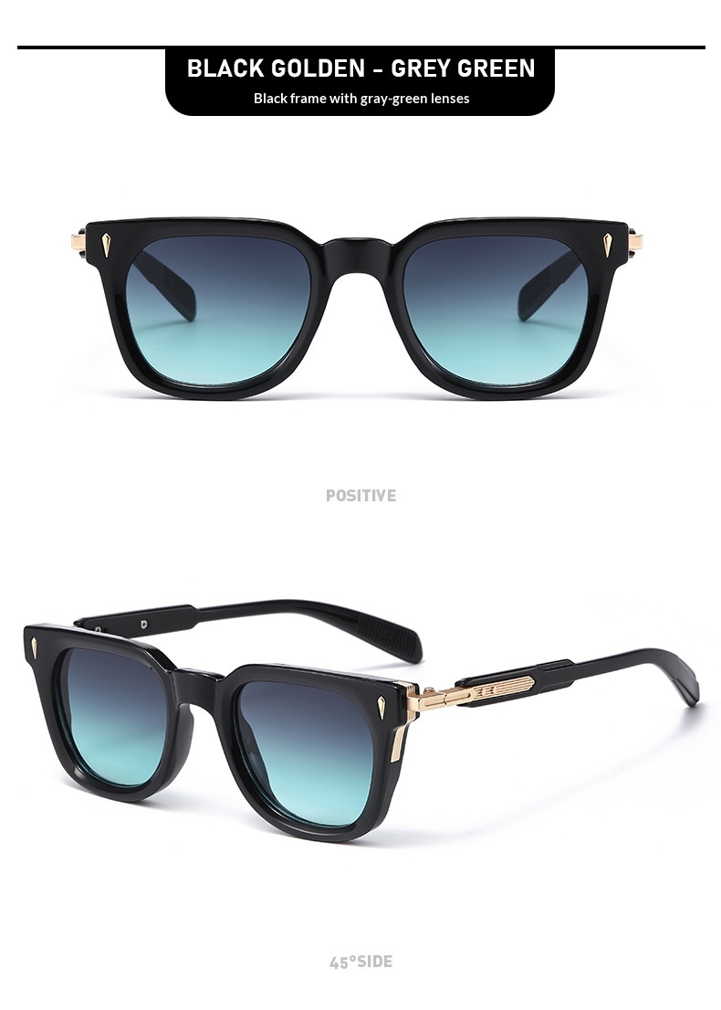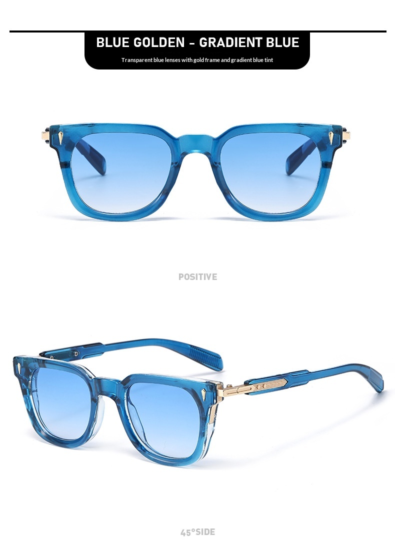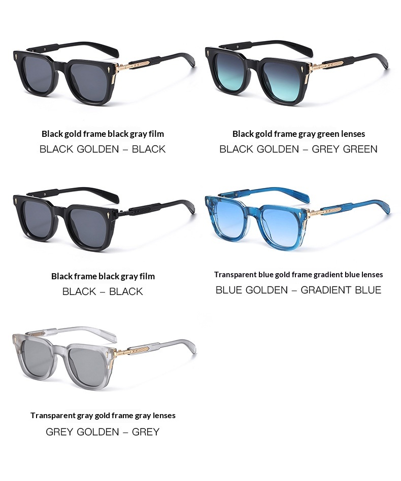 Colors: Black and gold frame with gray lenses, black and gold frame with gray-green lenses, black frame with gray lenses, transparent blue frame with gradient blue lenses, transparent gray frame with gray lenses
